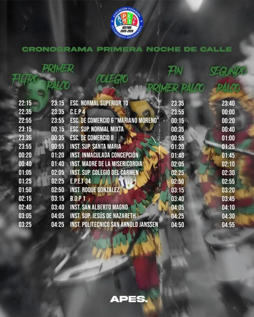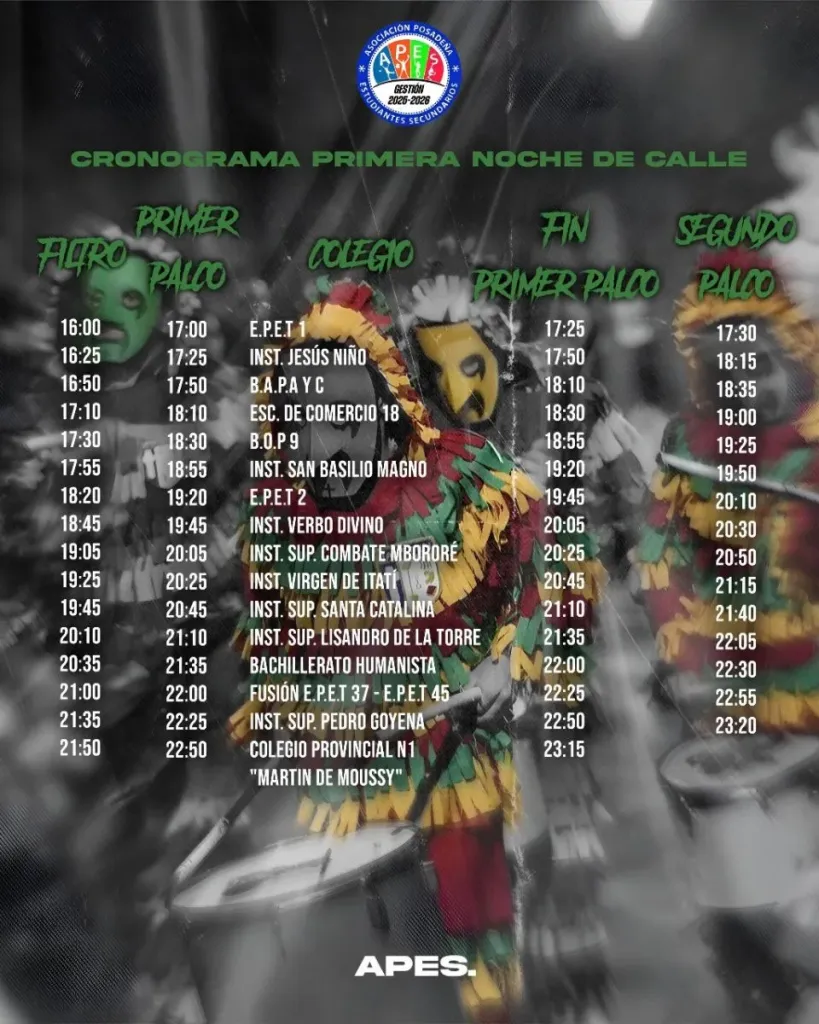 Tras las pruebas piloto realizadas días atrás, APES confirmó el orden de participación para la primera noche. El desfile comenzará a las 17 horas con la presentación de la EPET Nº1, conocida como “la Industrial”, seguida por el Instituto Jesús Niño. El cierre estará a cargo del Instituto Politécnico San Arnoldo Janssen.