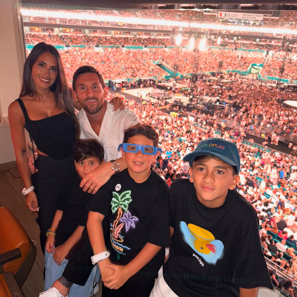 El astro rosarino fue al recital de la banda que lidera Chris Martin junto a su esposa y sus hijos en el Hard Rock Stadium