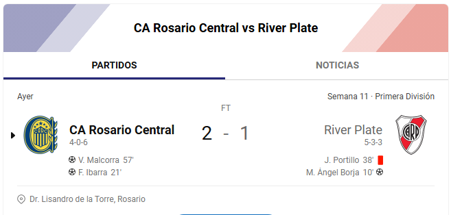 Con este resultado, River suma su tercera derrota consecutiva en el Clausura y se aleja de la cima, mientras que Central se consolida como uno de los animadores del torneo.