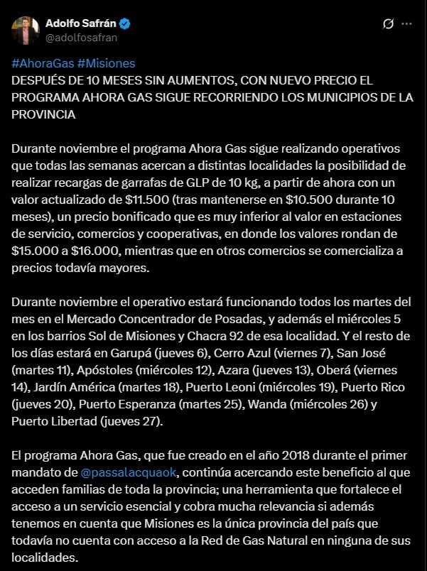 El programa Ahora Gas sigue en noviembre con garrafas de 10 kg a $11.500, recorriendo municipios misioneros. El precio se mantiene por debajo del mercado para apoyar a las familias.