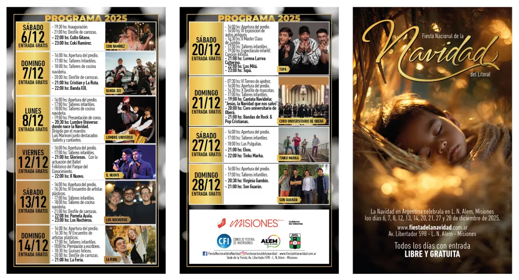 La tradicional Fiesta Nacional de la Navidad del Litoral celebrará su XXX Edición en Leandro N. Alem a lo largo de los cuatro fines de semana de diciembre. La organización confirmó el detallado cronograma de espectáculos, que conjugará grandes figuras nacionales, talentos regionales y una vasta agenda cultural y religiosa.