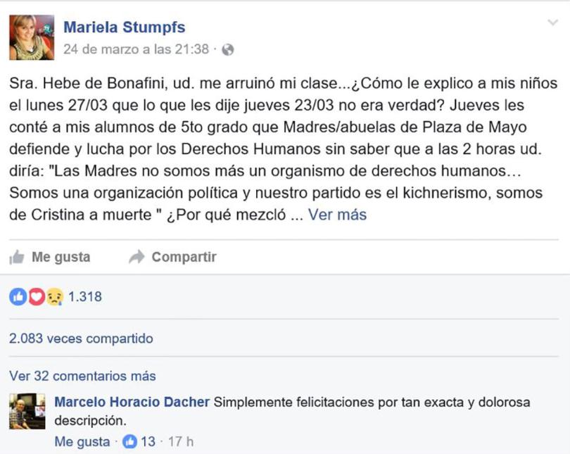 Una docente obereña, Mariela Stumpfs, escribió una carta dirigida a Hebe Bonafini,fundadoras de la Asociación Madres de Plaza de Mayo.